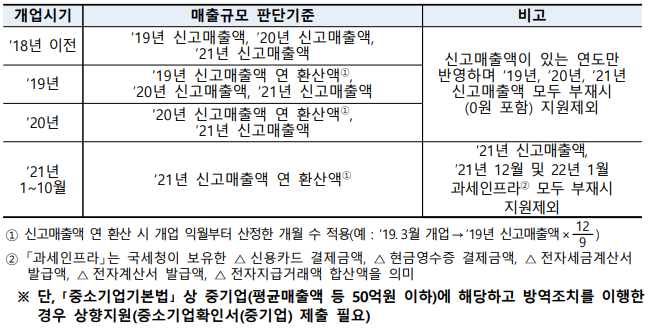 국세청 사업자등록 사업체(상시근로자 수 무관)로 매출규모는 매출액이 소기업 또는 50억 원 이하 중기업에 해당됩니다. 개업일 기준으로 사업자등록증 상 개업일이 ‘21년 12월 15일 이전이어야 하고, 폐업일은 21년 12월 31일 기준 폐업 상태가 아니어야 합니다.