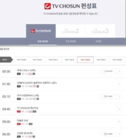 다만, 스마트폰에서 TV조선 온에어를 시청하려면 로그인이 필요합니다. 또한, TV조선 방송 편성표는 메인 화면의 우측 상단 "편성표" 메뉴를 클릭하여 확인하실 수 있습니다.